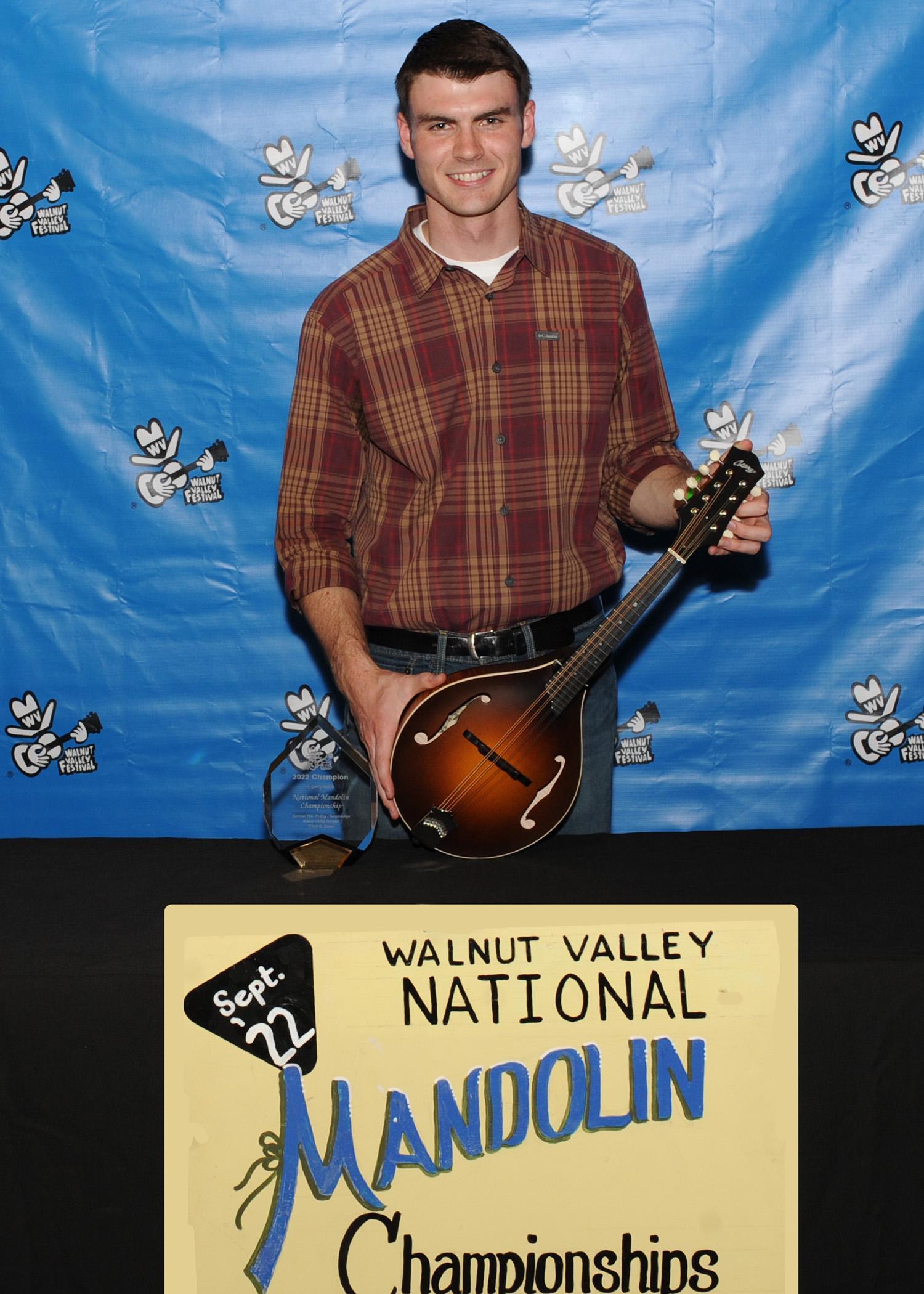 Holten Doucette, Waller, TX, went home with the First Place trophy and the Collings MT A-style Mandolin by Collings Guitar, Inc. of Austin, TX. He was a returning finalist from the 2021 championship and although he had more time to play, he said, the last two years were important years in his development – ages 20-22. “My mind hopefully matured a lot. I feel that musically, I’ve just been able to kind of step up in the maturity,” he explained. Doucette just completed his bachelor’s degree in business management and says he is an aspiring day trader. “I just day trade my own account. What I’m looking for is financial freedom and the ability to sleep at night. Doucette has primarily competed at Walnut Valley Festival – seven years running. He also plays guitar and won in flat pick the following day. He accompanied his younger brother in the Old Time Fiddle Championship later that day. The advice he gave him for his first Walnut Valley contest was to not take things too seriously. Doucette says that he really loves just picking with all the guys backstage. “We get a little jam going under the grandstand with all the cool instruments under there,” he said. “That’s really what I like the most.”