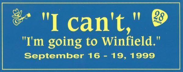 Blue and Yellow “I can’t, I’m going to Winfield.” Bumper Sticker. Measures 7.5″ x 3″.