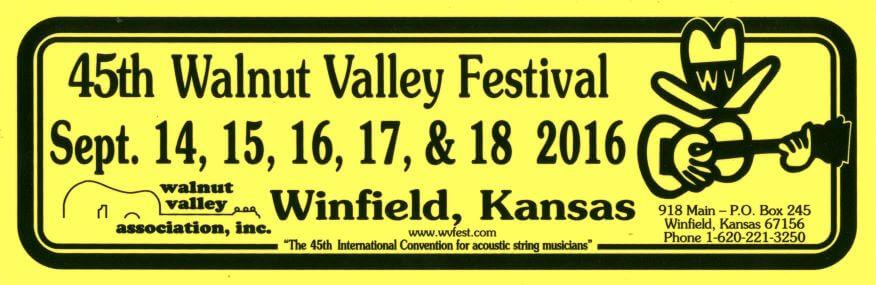 Yellow and Black Bumper Sticker advertising the Walnut Valley Festival.